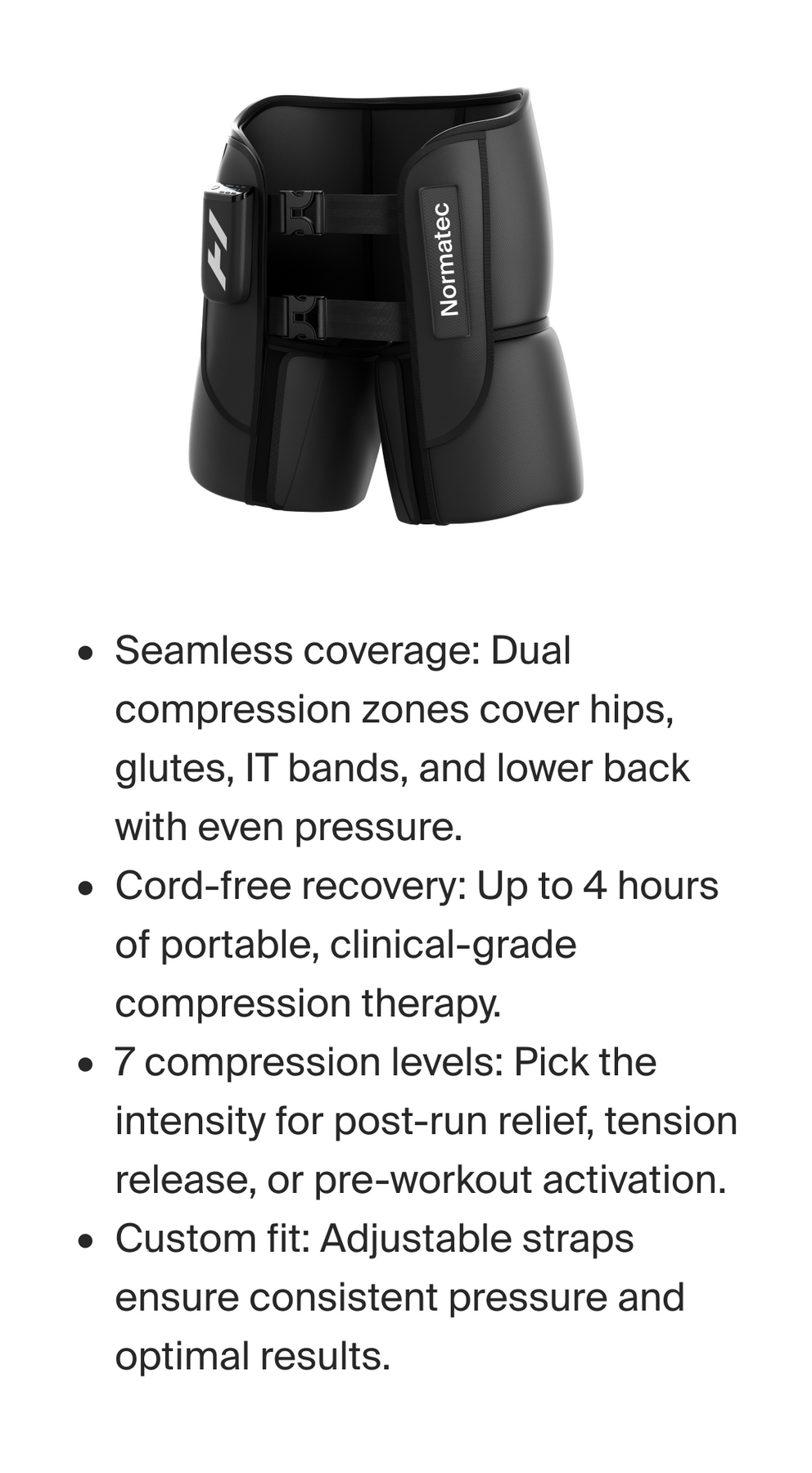 Dynamic air compression for hips and lower back to boost circulation, loosen tightness and recover faster.